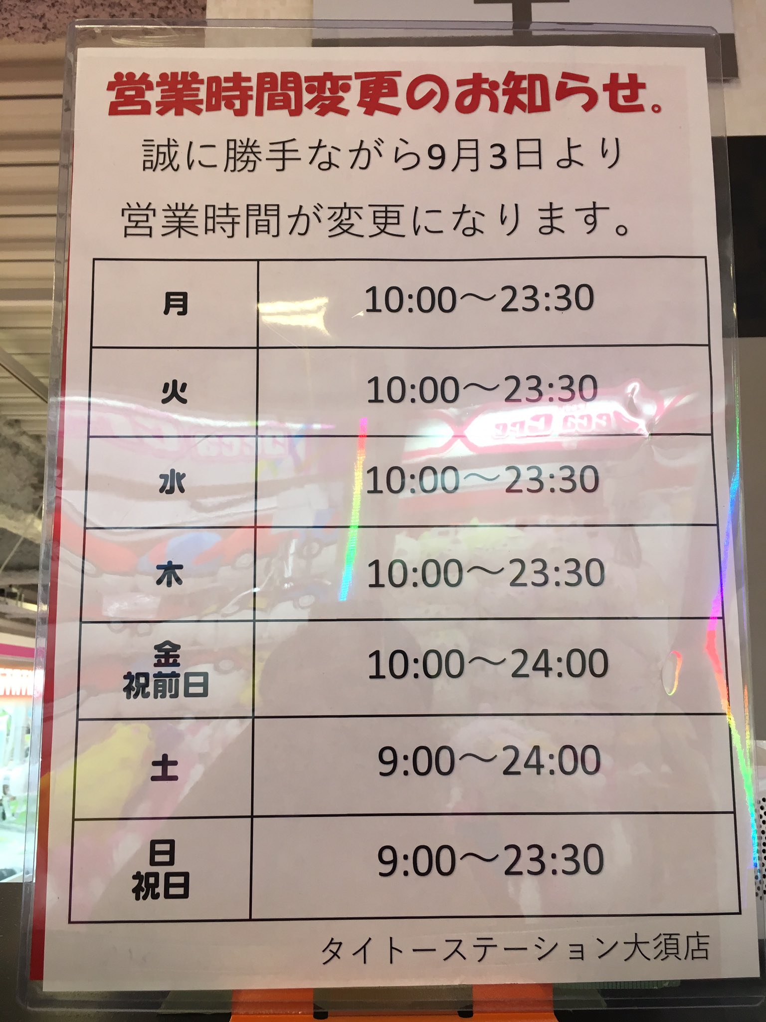 タイトーステーション 大須店 A Twitter 営業時間変更のお知らせです 9 3より開店時間 閉店時間共に写真の通りに変更となります ご来店の際はお間違いの無いようにお気を付け下さい タイトー 大須